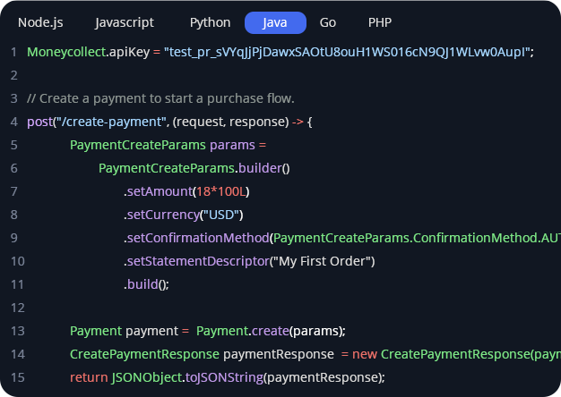 You can get started quickly with MoneyCollect comprehensive libraries which are available for all of the most commonly used languages and frameworks.