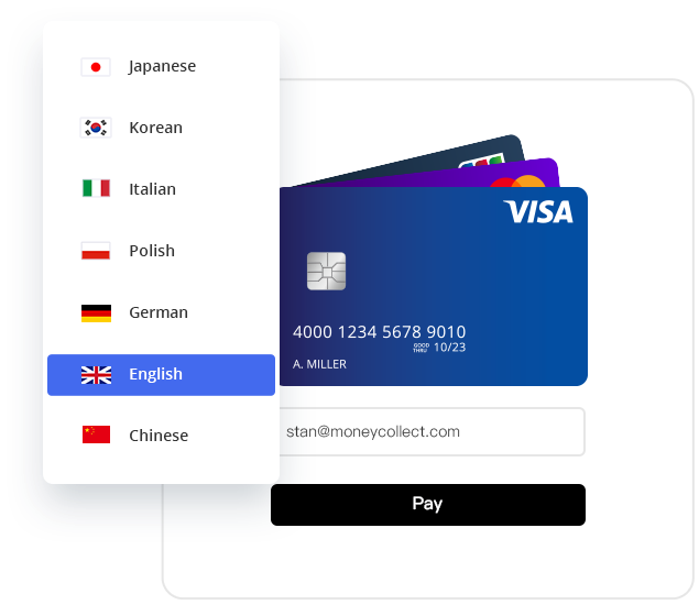MoneyCollect 能夠處理 >200 個國家及地區所使用的貨幣。 隨時隨地享受涵蓋網站、在線商店、Android、iOS 和移動應用程序的無縫安全結帳。