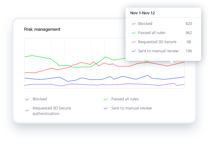 使用先進的欺詐防禦技術與可定制的風險規則,阻止欺詐,防止糾紛,以適應不斷變化的新欺詐模式。 一站式檢測和管理方案讓您一目了然。